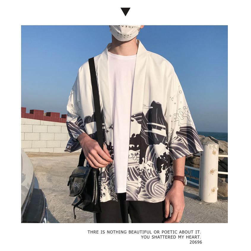 Haori Nhật Bản, áo choàng haori rồng Gió Trung Quốc sóng, núi trắng đen